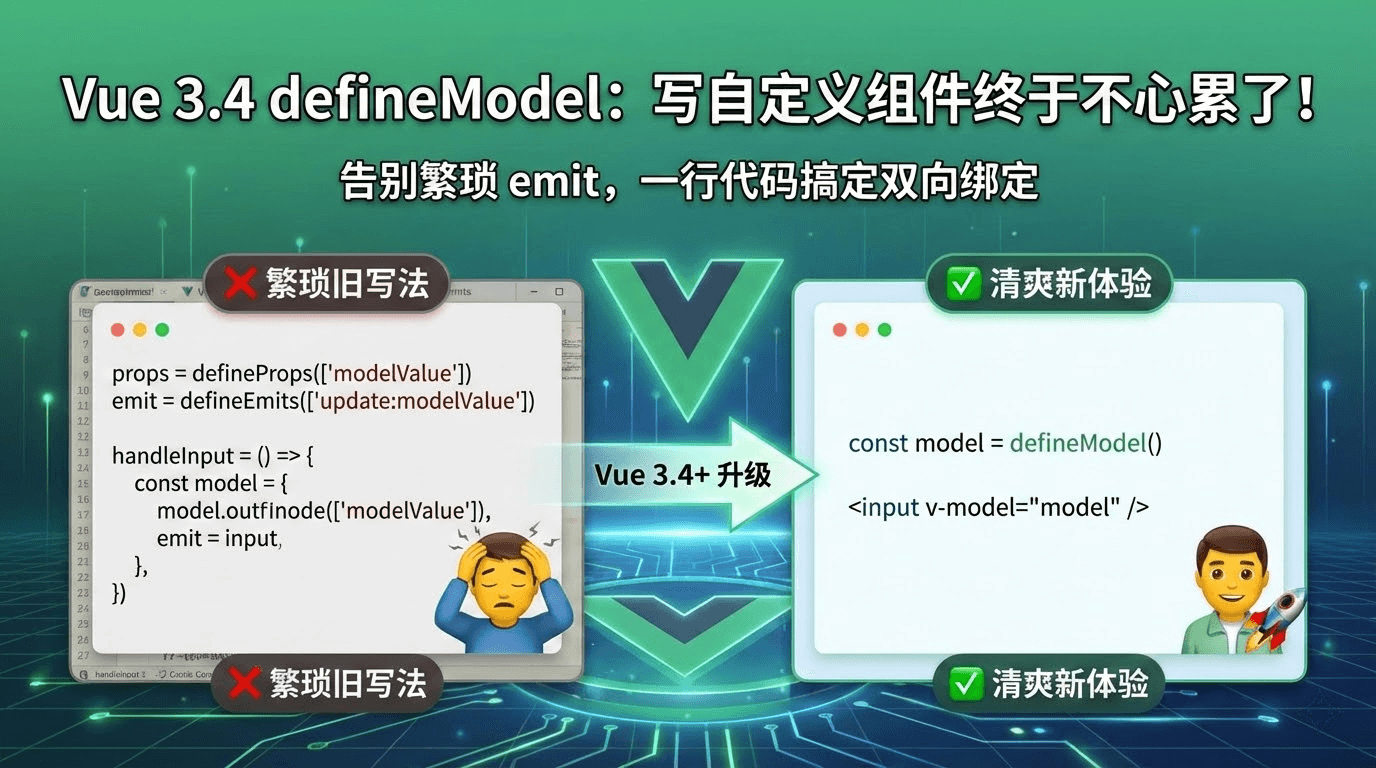最近在重构项目时试了下 Vue 3.4 刚转正的 defineModel,感触挺深的。以前写个 v-model 逻辑要拆成三四份,现在一个宏全搞定